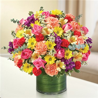 Express your condolences with our truly original sympathy arrangement of bright and beautiful roses, stock, alstroemeria, carnations and more. Designed by our florists to offer comfort to friends and family during difficult times of loss. Graceful, bright-toned arrangement of roses, stock, alstroemeria, carnations, daisy poms, mini carnations and monte casino, gathered with variegated pittosporum and spiral eucalyptus Hand-designed by our expert florists in a stylish clear glass cylinder vase wrapped with a Ti leaf ribbon; vase measures 6"H Appropriate for the service or the home of friends and family members Large arrangement measures approximately 16"H x 17"L Medium arrangement measures approximately 15"H x 16"L Small arrangement measures approximately 14"H X 15"L Our florists hand-design each arrangement, so colors, varieties, and vase may vary due to local availability